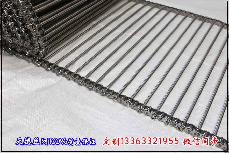 鏈桿輸送帶可采用碳鋼、不銹鋼201/304/316不銹鋼材料,以鏈條傳動,鏈條可選用標準鏈條和雙節距輸送鏈條使網帶受力減小容易安裝網帶的附屬配件,如擋板,側翼,用于輸送固體物料,通透性好,易清洗. 旋的繞絲串起來形成平衡編織的輸送網,螺距能做到3毫米,每1米寬網帶有333個圈。節距能做到6毫米,每1米網帶長有166根曲軸。 該網帶通常網絲是圓的,但也可以制作成扁絲的。材料可選碳鋼、201不銹鋼、304不銹鋼、316不銹鋼等。