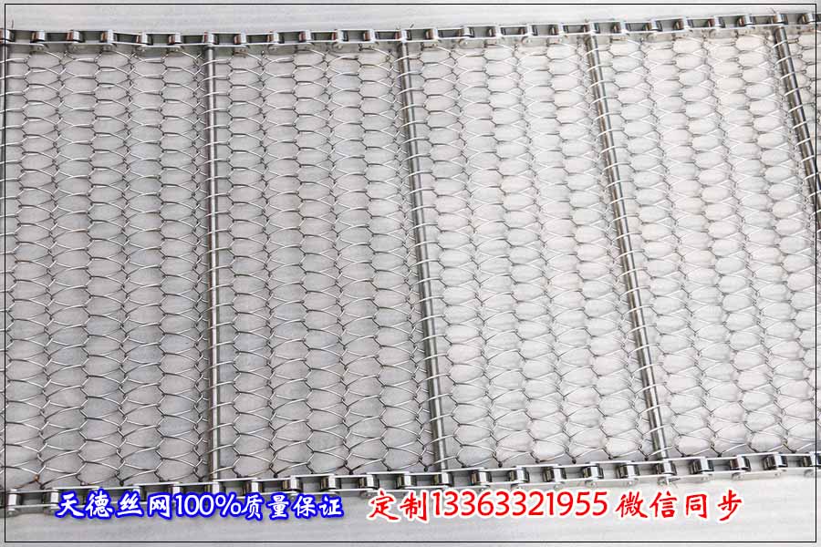 今天上午湖北咸寧客戶來(lái)電咨詢鏈條式不銹鋼網(wǎng)帶,用來(lái)蒸煮熱干面,干面如同蕨根粉般粗細(xì),在經(jīng)過一番的了解后,定制規(guī)格為: 食品輸送網(wǎng)帶我們采用不銹鋼304材質(zhì),這樣不會(huì)影響食品的質(zhì)量,干凈衛(wèi)生,能夠保證面條的原有鮮味。面條輸送網(wǎng)帶采用的結(jié)構(gòu)形式為鏈條式不銹鋼網(wǎng)帶,鏈條網(wǎng)帶總寬為40公分,長(zhǎng)為20米,每米輸送網(wǎng)帶上面的載重量在10公斤以下,根據(jù)輸送使用絲徑為1.0毫米,根據(jù)輸送面條的大小不銹鋼網(wǎng)帶的孔定制為5*10毫米,不銹鋼鏈條網(wǎng)帶的節(jié)距為25.4毫米,不銹鋼圓棒支撐桿直徑為6毫米,圓棒之間的間距為150毫米,材質(zhì)選用全部304不銹鋼。