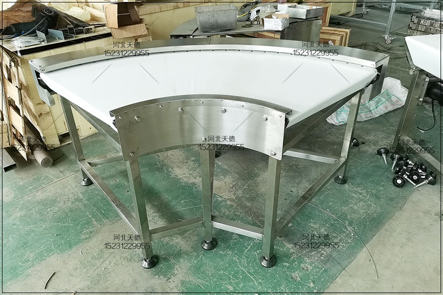 Transmission principle of stainless steel conveyor with circular belt turning for soap packaging