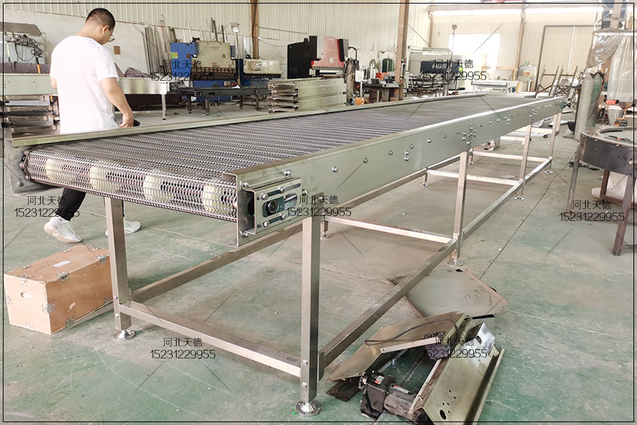 7.食品網(wǎng)帶輸送機可靠性高。結(jié)構(gòu)簡樸,運動部件自重輕,只要金屬網(wǎng)帶不被撕破,壽命可長達十年之上,而金屬結(jié)構(gòu)部件,只要防銹好,幾十年也不壞。