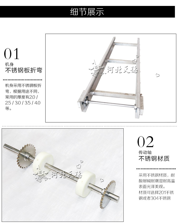適用范圍:廣泛應用于飲料瓶、鋁罐、藥品、化妝品、食品等行業的輸送,通過選用不同的網帶可以制作成儲瓶臺、提升機、殺 菌 機、蔬菜清洗機、以及肉食品輸送等行業專用設備。考慮網帶承受拉力限 制,單線長度一般不超過20米。
