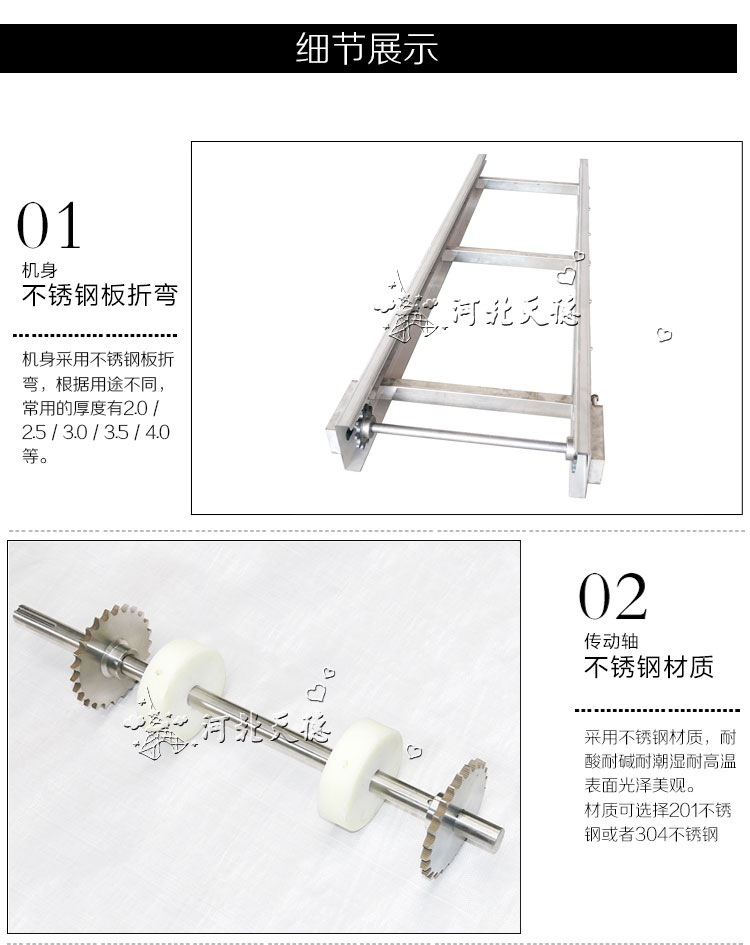 1.網帶輸送機以不銹鋼網帶為輸送介質,其特性堅固,耐磨、不拍尖銳的物品劃傷,輸送豬肉、雞鴨、魚蝦等干凈衛生;