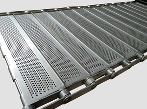 帶擋板的鏈條網帶鏈條的內側加裝的擋板,擋板可以是單獨加裝也可以是加高鏈條片,加裝側面擋板以后可以有效的防止在輸送物料的過程中物料側漏,因為擋板和輸送帶是同步運轉所以加裝擋板以后還可以防止在輸送過程中物料可機身發生接觸和摩擦,避免了物料的損壞和網帶的卡頓。